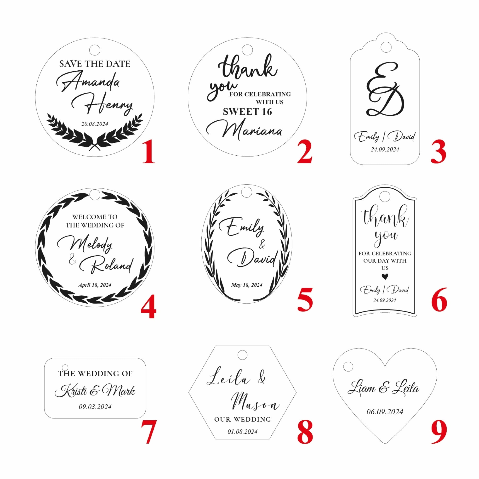 • 📐 Various Size Options Choose the size that best suits your event aesthetic—from dainty mini-tags to statement-sized decor pieces.